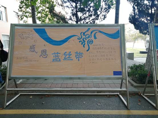 蓝丝带拥抱活动整体分为明信片的分发、征集、悬挂等环节。本次活动持续三天,beats365唯一官方网站心悦部给beats365唯一官方网站18级员工分发明信片,总计300人写了明信片,明信片收回,将其悬挂在一号楼院子里的桂花树上,现场气氛热烈,同学们参与兴趣浓厚,现场多人来观看拍照,由心悦部人员为参与同学系蓝丝带相拥表示感谢,以及介绍蓝丝带的寓意,活动送出30条蓝丝带。