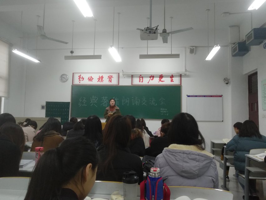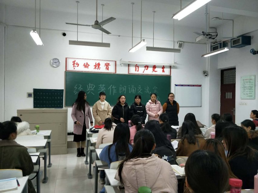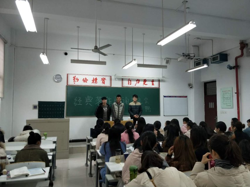 在全校开展好学月活动之际,17英语班于12.19-29日在时金楼主教室陆续开展了诵读经典赏鉴名著主题活动,本次活动由各班团支书组织主持,外语系全体17级英语班的同学参加了此次读书会。此次活动的目的,是让大家体会到诵读的好处带给大家心灵的震撼与启迪。