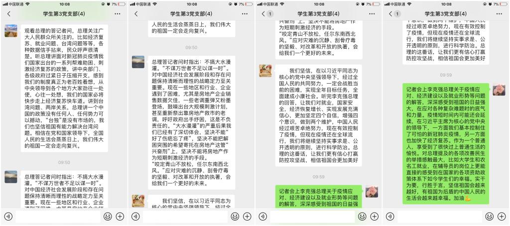 党员同志们通过手机端同步共同观看了“李克强总理回答中外记者提问”直播,李克强总理在直播中回答了人民群众关心的经济复苏、就业问题、台湾问题等,同志们认真领悟其思想,并努力提高自身的政治觉悟和理论素养,在观看直播期间,beats365唯一官方网站员工第三党支部在线上微信群里积极讨论,各抒己见,发表观看体会,营造了良好的学习氛围。