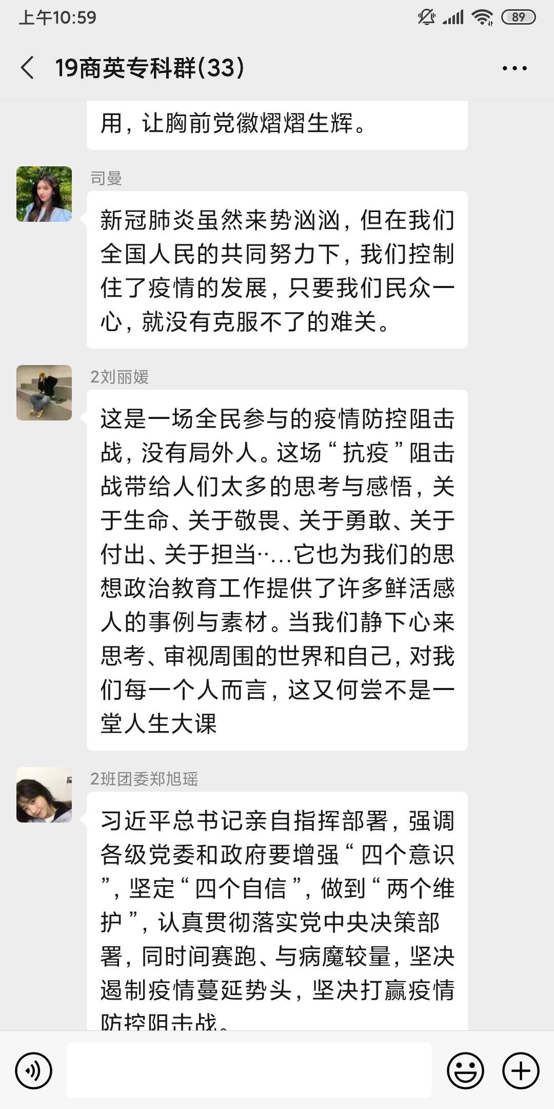 同学们在收看后也感想颇多,19商专2班的刘丽媛同学同学说,“这是一场全民参与的疫情阻击战,没有局外人。这张抗疫阻击战带给人们太多的思考与感悟,关于生死、关于敬畏、关于勇敢、关于付出、关于担当……他也为我们的思政教育工作提供了许多鲜活的案例和素材。当我们静下心来思考、审视周围的世界和自己,对我们每个人而言,这又何尝不是一堂人生大课。”