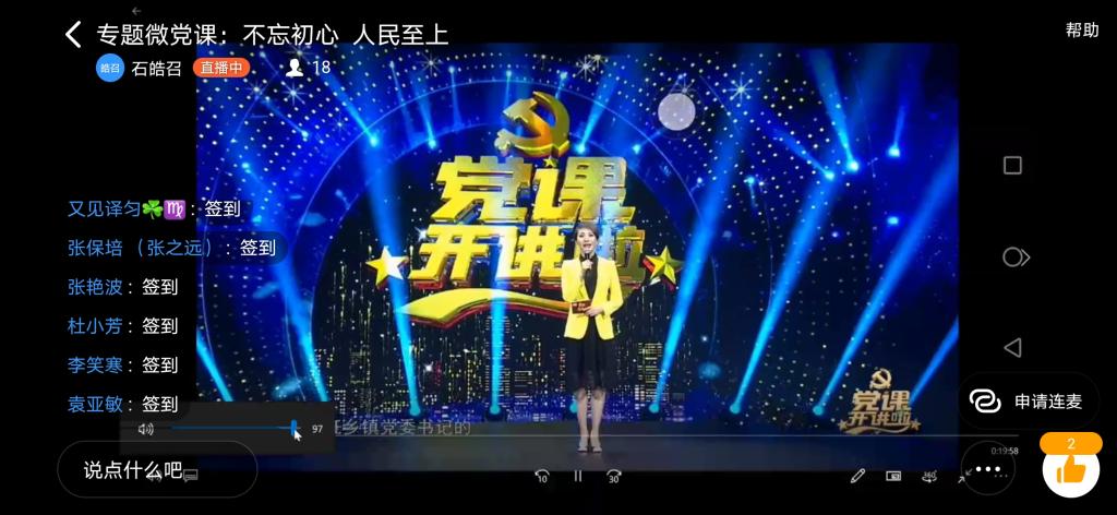 第一期党课由河南省卫辉市唐庄镇党委书记吴金印主讲。在党课上,讲述他扎根群众,扎根基层,苦干实干,带领唐庄人民勤劳致富的先进事迹。吴书记通过回答“为了谁”、“我是谁”、“依靠谁”,生动阐释了习近平新时代中国特色社会主义思想和中国共产党成立99周年来“不忘初心、人民至上”的使命与担当。