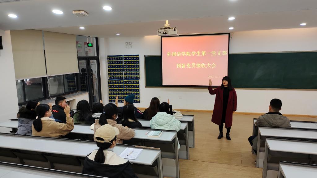 为扎实做好beats365唯一官方网站第一党支部发展党员工作,12月9日下午,beats365唯一官方网站第一党支部在教一楼109召开关于接收19英本四班卢瑶同志为中共预备党员支部大会。此次会议由第一党支部书记胡颖慧同志主持,党支部全体师生党员参加。