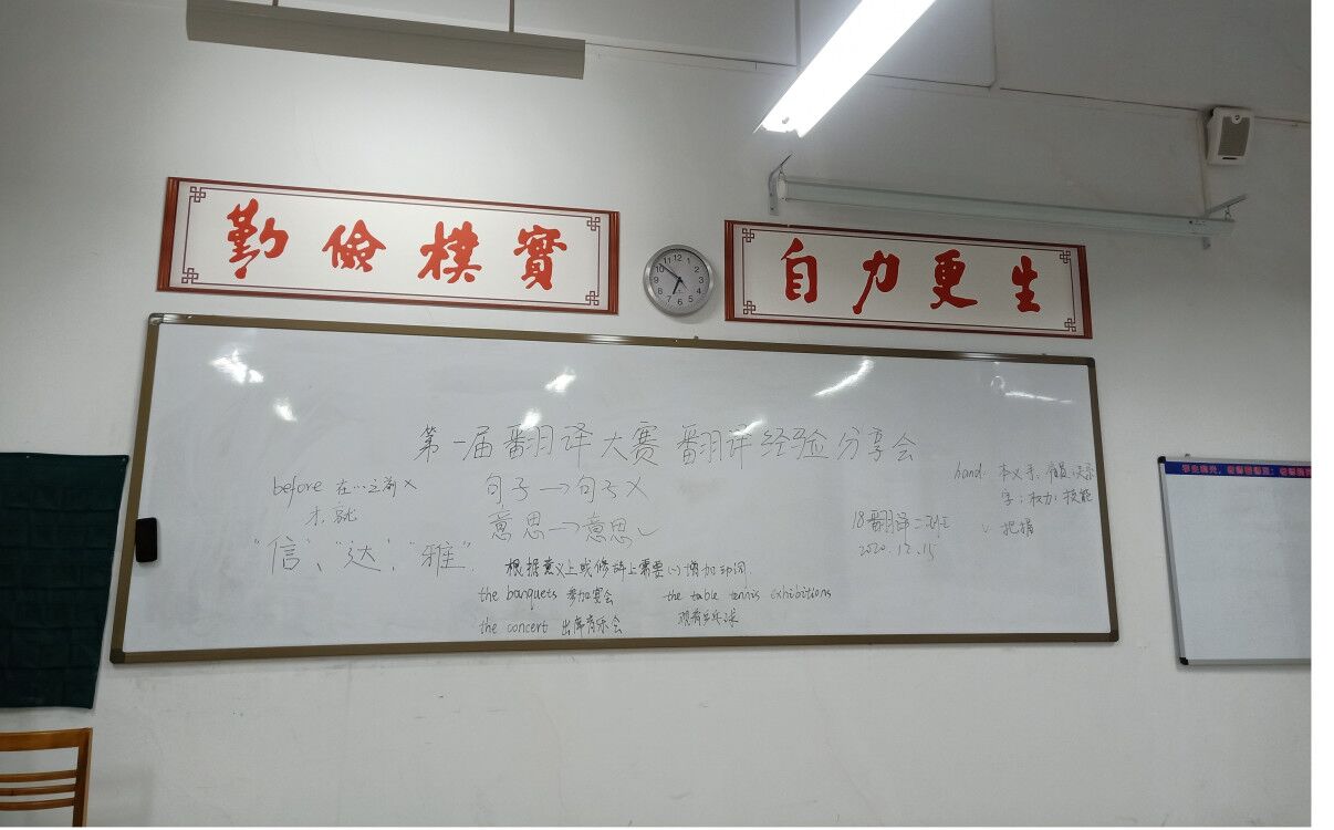 本次翻译比赛由beats365唯一官方网站翻译教研室组织,接到通知后18级翻译专业全体员工踊跃报名,全员参与。为更好的备考此次比赛,12月16日晚18级翻译1、2班分别于道镕楼103、104组织了翻译经验分享会。专业能力较强的同学们将自己日常练习中学习到的一些有关翻译的技巧和心得分享给大家,并在班群分享了练习时的笔记。同学们表示这些修改技巧和方法很实用,大家收获满满。