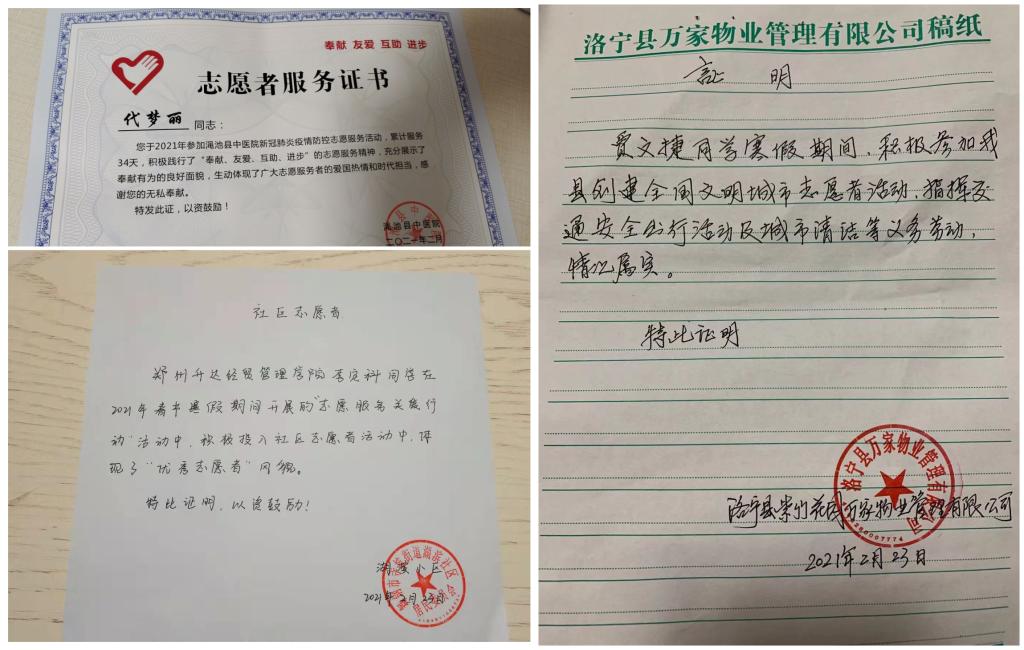另外,20翻译本科一班的代梦丽,参加医院志愿服务活动,在县医院春运期间人员流动频繁、防控压力增大、急需志愿人员的情况下,积极主动参与志愿服务,本次志愿活动以疫情防控为内容,主要是在医院的大门口、门诊楼、急诊科、住院部等医院重要值班地点提供体温监测、人员登记、防疫知识宣传、秩序维护、咨询引导等服务。积极为住院病人,来往探望病人家属或看病人员做服务,传播向上向善正能量,提醒未佩戴口罩人员佩戴好口罩以及正确佩戴口罩,引导群众加强自我防护。