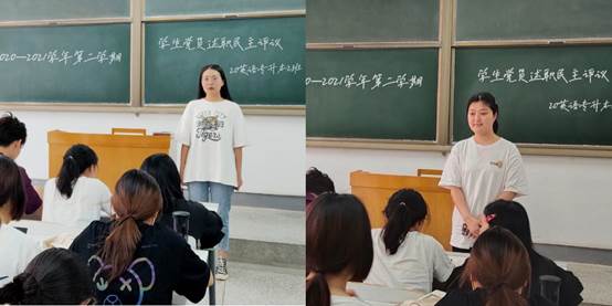 在评议开始前,党支部书记胡颖慧同志对近阶段工作进行报告总结,简述了会议的主要流程,阐述了组织定期开展员工党员述职民主评议的必要性。并按照工作要求,述职评议以班级为单位组织开展,员工党员述职从学习、工作、生活、守纪等四个方面,向所在班级同学汇报相关落实和表现情况,接受同学们监督,并在党员之间相互学习。