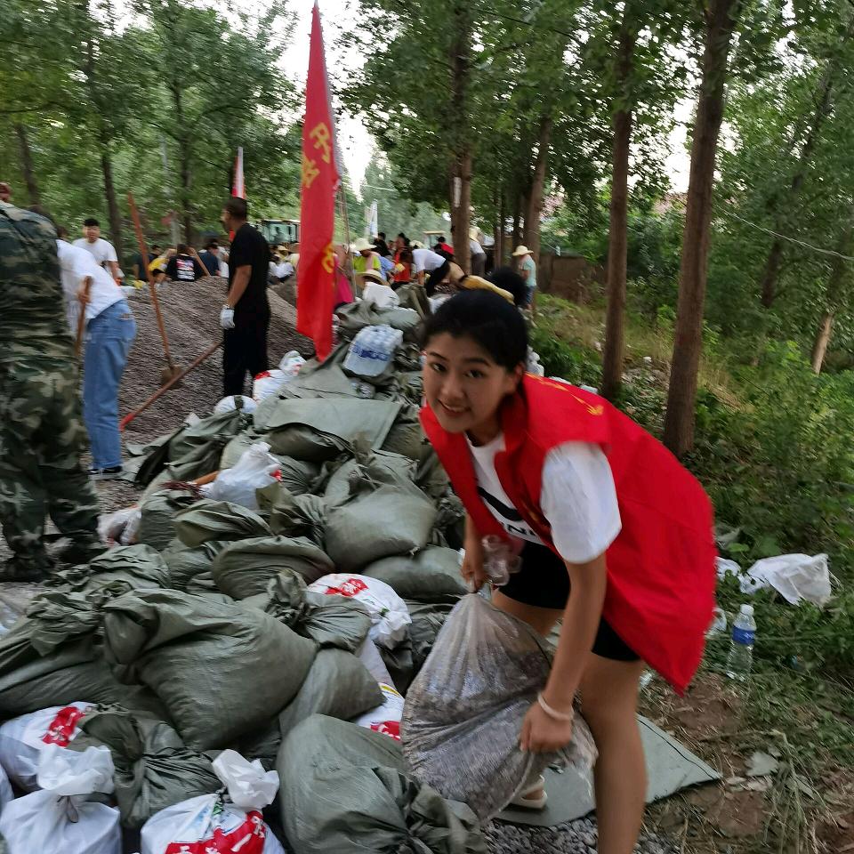 7月24日晚苏晓晗主动第一次参加泄洪,水流湍急,帮助其他爱心人士救助邢庄乡居民转移到邢庄第一中学。7月29日下午苏晓晗在爱心群里看到需要第二次志愿者协作,再度积极参加加入志愿救援队伍,装石袋、用石袋堵坝口。