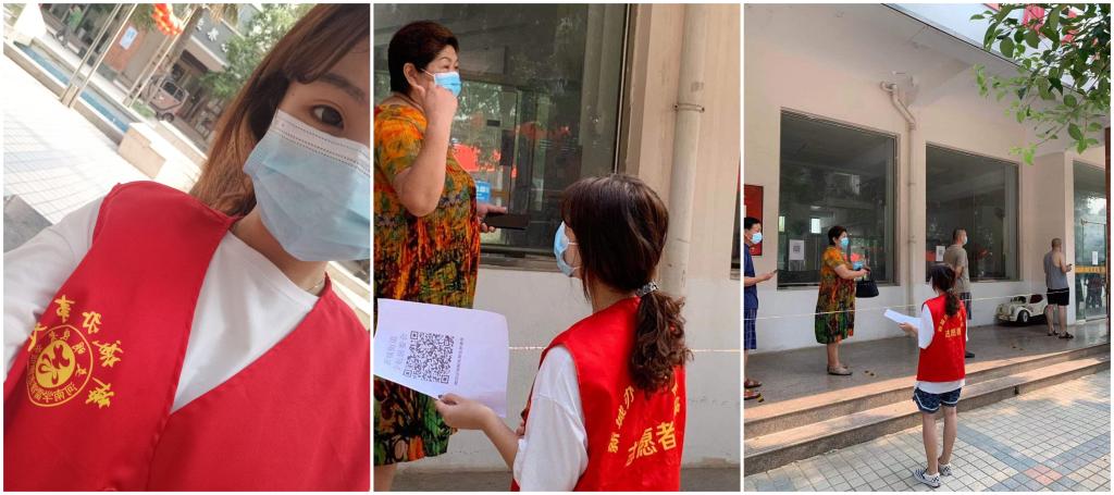 20级商务英语专科二班员工李焕焕,共青团员,班级宣传委员。受疫情的影响,8月18日商丘开启第五轮核酸检测,李焕焕所在社区承担的工作量大,人员力量有限,她得知情况后主动请缨,积极参与社区核酸检测志愿服务工作。李焕焕同学配合社区工作人员对前来做核酸检测的社区居民进行扫码登记信息,同时,负责维持现场秩序,提醒大家带好口罩,间隔一米,按照顺序排队;隔一段时间,她还要拿着消毒液对登记点、检测台以及地面进行消毒,时不时也对着自己喷个全身。除此之外,李焕焕还要负责一些其他琐碎的工作,比如现场检测人员各类问题的解答,帮助不会使用智能手机的老人做登记,医护人员临时的帮助与配合等等。