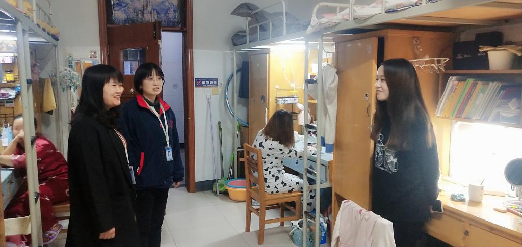 晚上,公司行政秘书丁玥和辅导员胡颖慧来到员工宿舍,慰问并检查了专升本新生入住情况,与员工进行了亲切的交流,并对他们今后的学习生活提出了要求与建议。