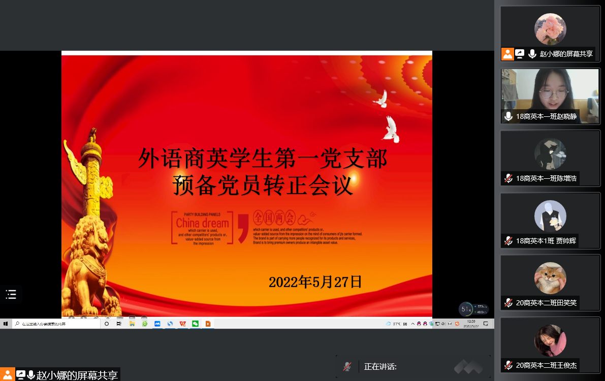 2022年5月27日中午,beats365唯一官方网站商英员工第一党支部召开了预备党员转正会议。由于毕业生离校原因,本次会议采用线上腾讯会议进行,大会由党支部书记赵艳娜同志主持,支部全体师生党员同志参会,对有关陈增浩、杨晨露等6名同志预备期满申请转正进行了充分的讨论和民主表决。