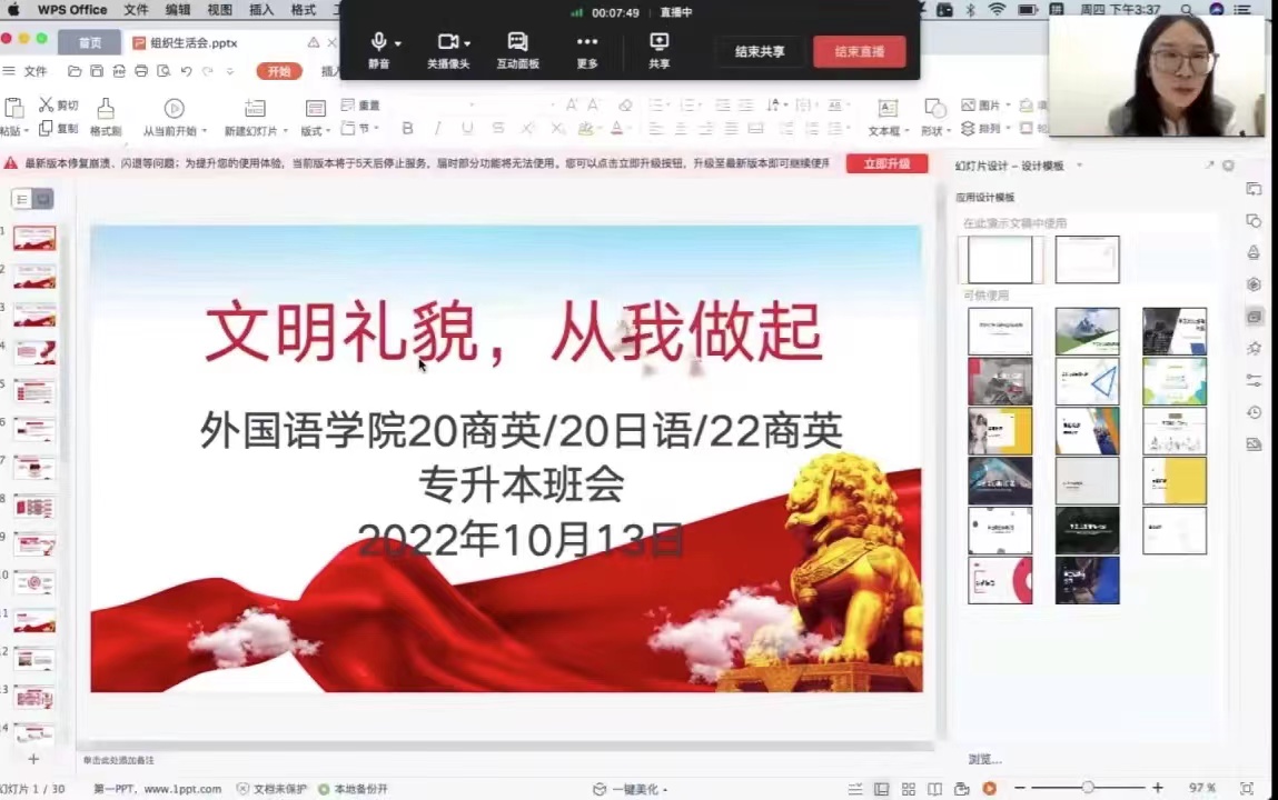 为推进文明校园建设,进一步提升生学文明礼仪素养,积极构建和谐文明校园。10月13日,20商英本1/2班,20日语本1/2班,22级商务英语专升本班,在辅导员崔艳婷老师组织下,召开“文明礼貌从我做起”线上班会。