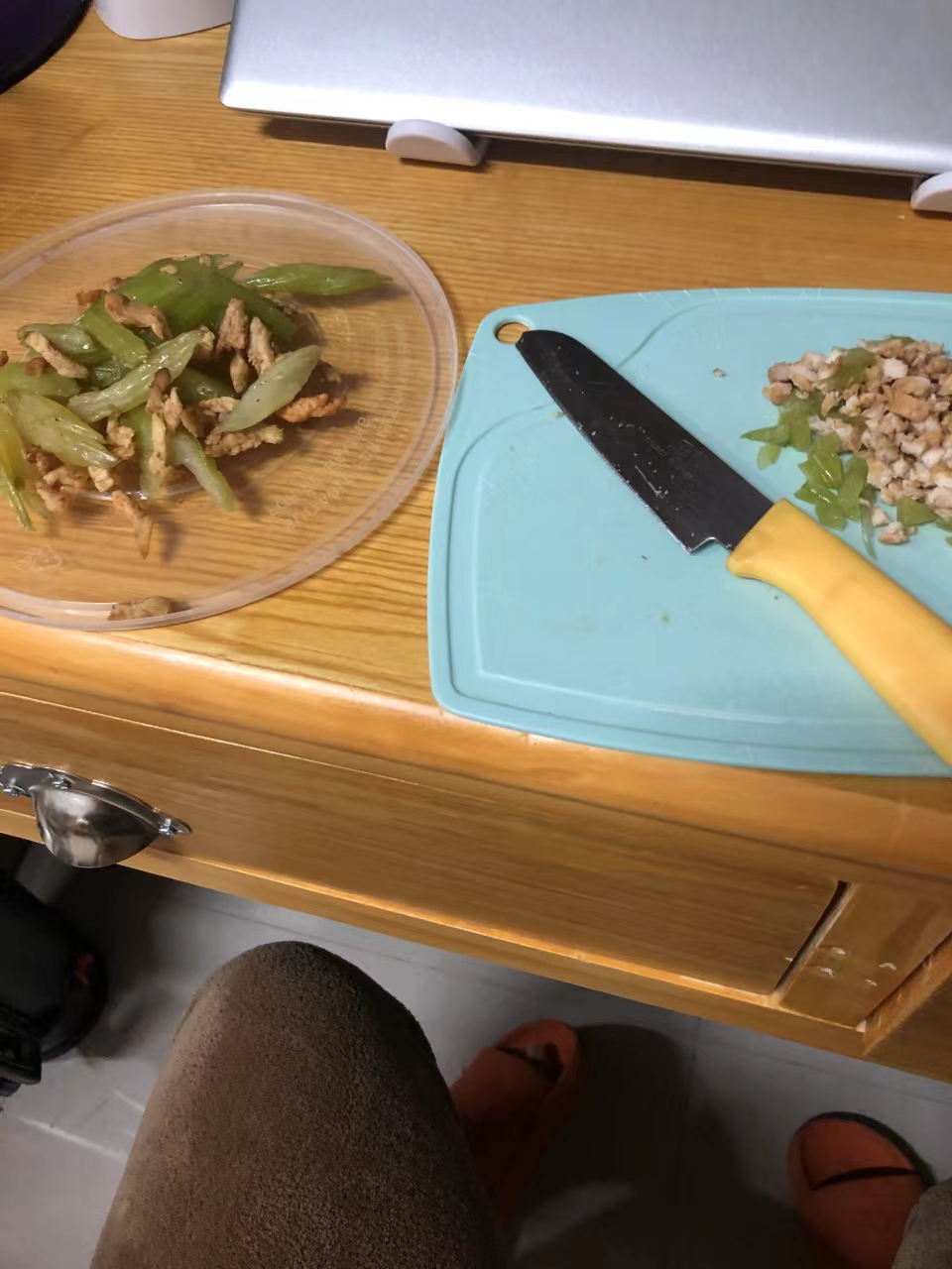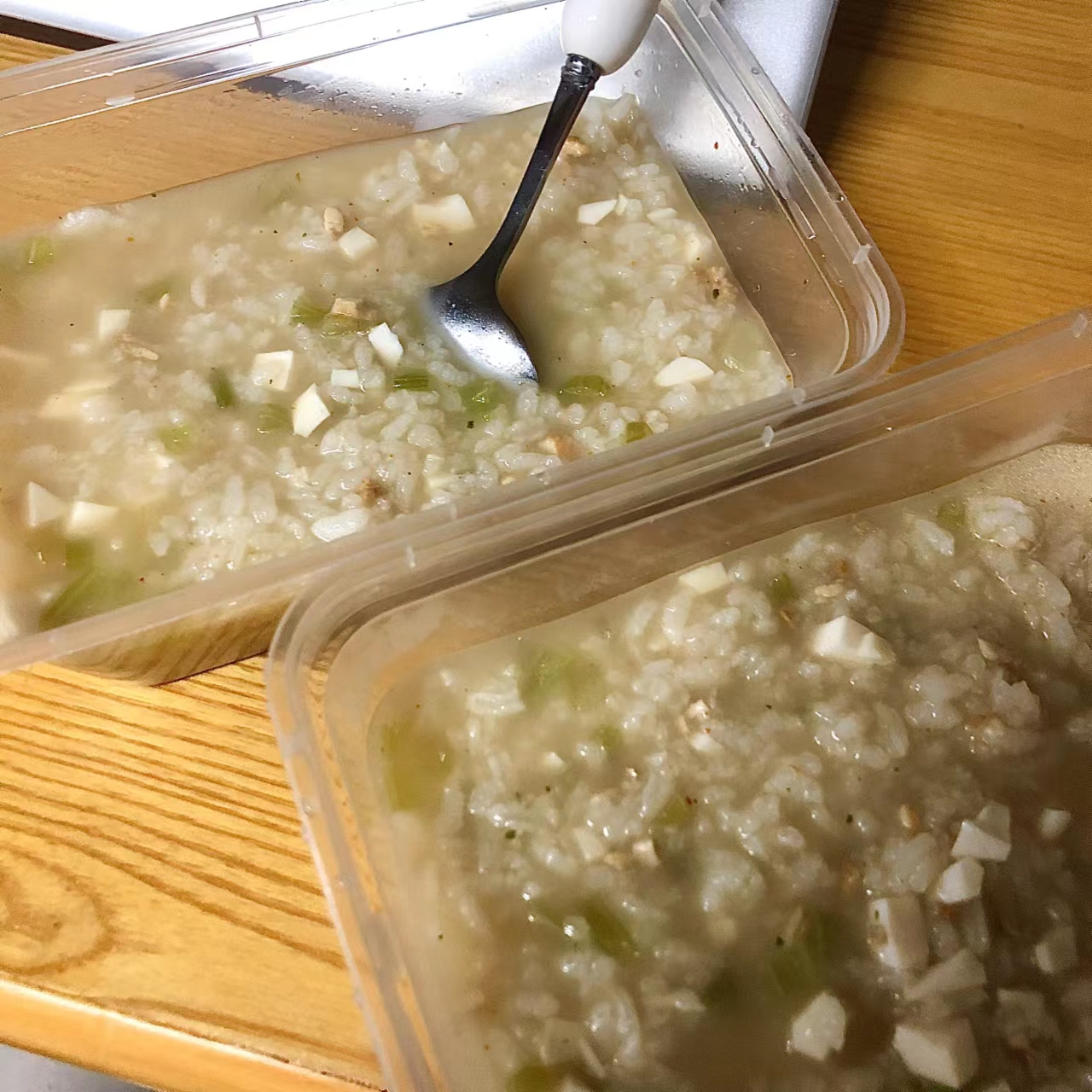 她把晚餐的芹菜鸡肉切成碎末,用鸡蛋代替皮蛋切碎,和剩余的白米饭一起倒入焖烧壶加入开水,不一会儿香喷喷的“皮蛋瘦肉粥”就出锅了!