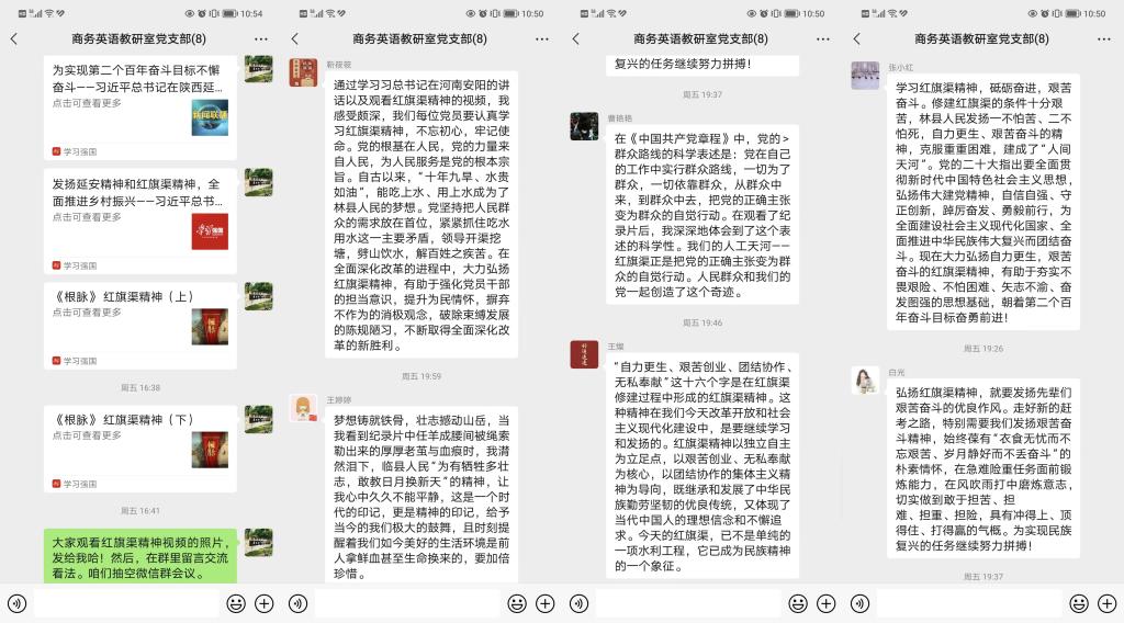 11月20日,商务英语教研室党支部开展“深入学习习近平总书记视察安阳重要讲话精神,大力弘扬红旗渠精神”组织生活会。支部全体党员认真学习习近平总书记视察安阳重要讲话,并再次观看了党史纪录片《根脉——红旗渠精神》,重温了英雄的林县人民——红旗渠的建造者,用自己的生命、用自己的实践凝练出来的自力更生、艰苦创业、团结协作、无私奉献的红旗渠精神,通过微信视频会议的方式分享交流了各自对讲话精神的理解,深刻认识到新时代红旗渠精神继承与弘扬的重大意义。