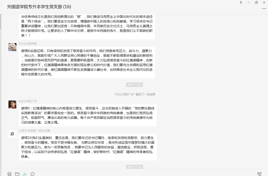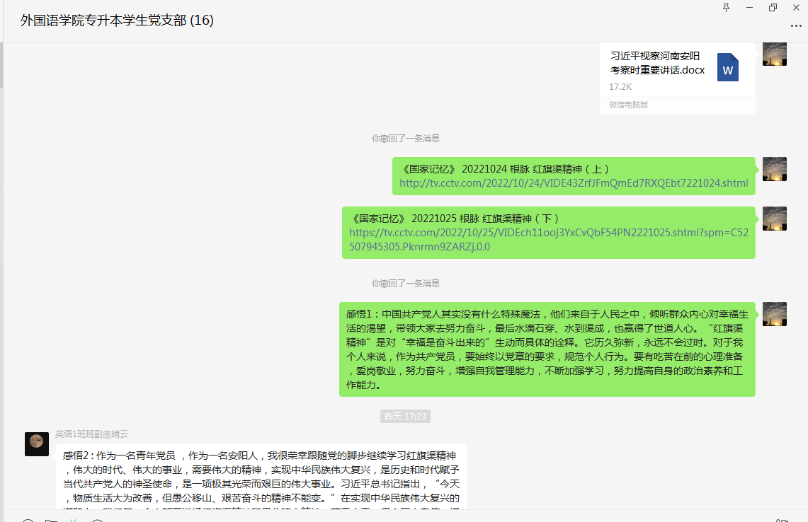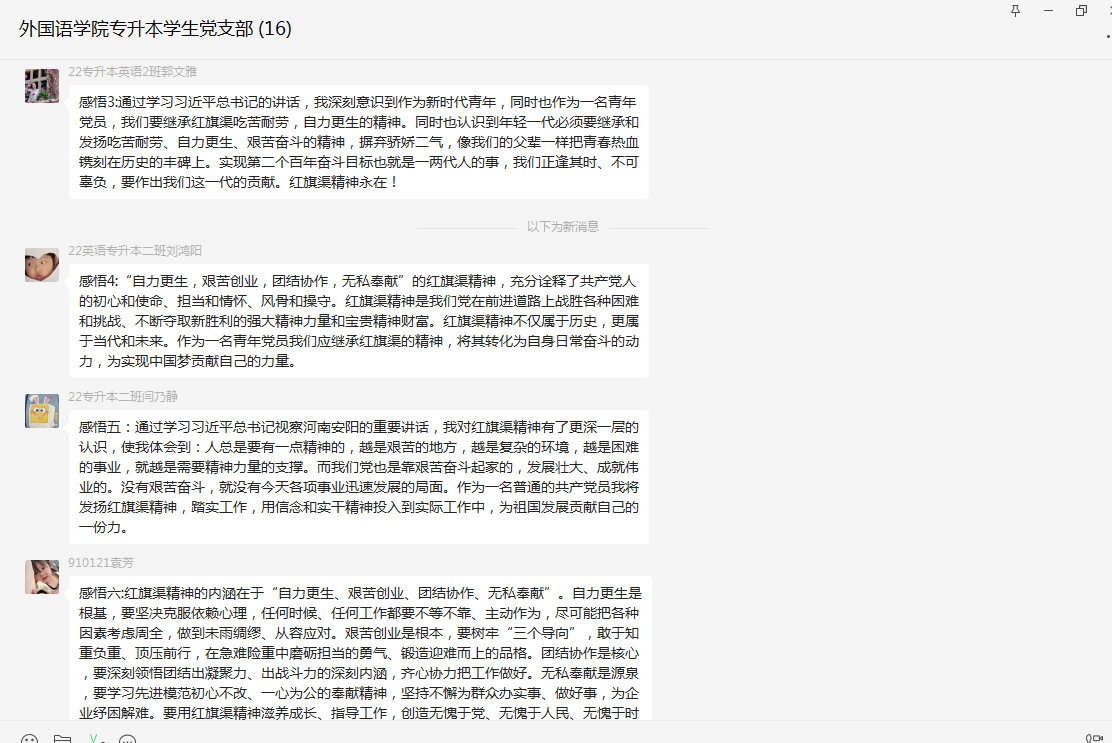 2022年11月25日下午,为深入学习贯彻党的二十大精神和习近平总书记视察河南安阳重要讲话精神,根据河南省委教育工委要求和校、院二级党委的安排,英语专升本员工党支部以“深入学习习近平总书记视察安阳重要讲话精神,大力弘扬红旗渠精神”为主题,召开线上专题组织生活会,会议由支部书记王彬同志主持。