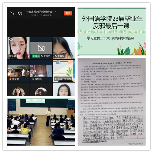 教育活动中,各毕业班班辅导员也通过班会形式进行反邪教教育,要求鼓励员工们树立正确的世界观、人生观、价值观,分清生活中的善恶、良莠,加深同学们对反邪教的理解。并通过签名倡议活动,向毕业生们传达防范邪教的知识和理念。通过反邪“最后一课”,让毕业生们能够保持初心,辨识邪教,抵制邪教。