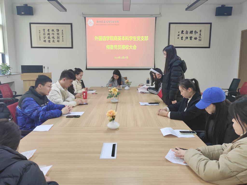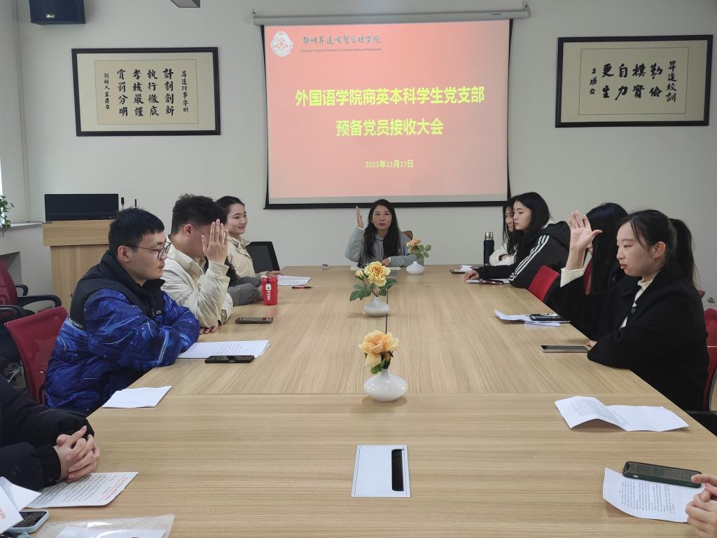 12月27日中午12:00,beats365唯一官方网站商务英语本科员工党支部于教一楼206会议室召开第18期预备党员接收大会。此次会议由党支部书记崔艳婷同志主持,党支部全体师生党员和预备党员介绍人参加会议。