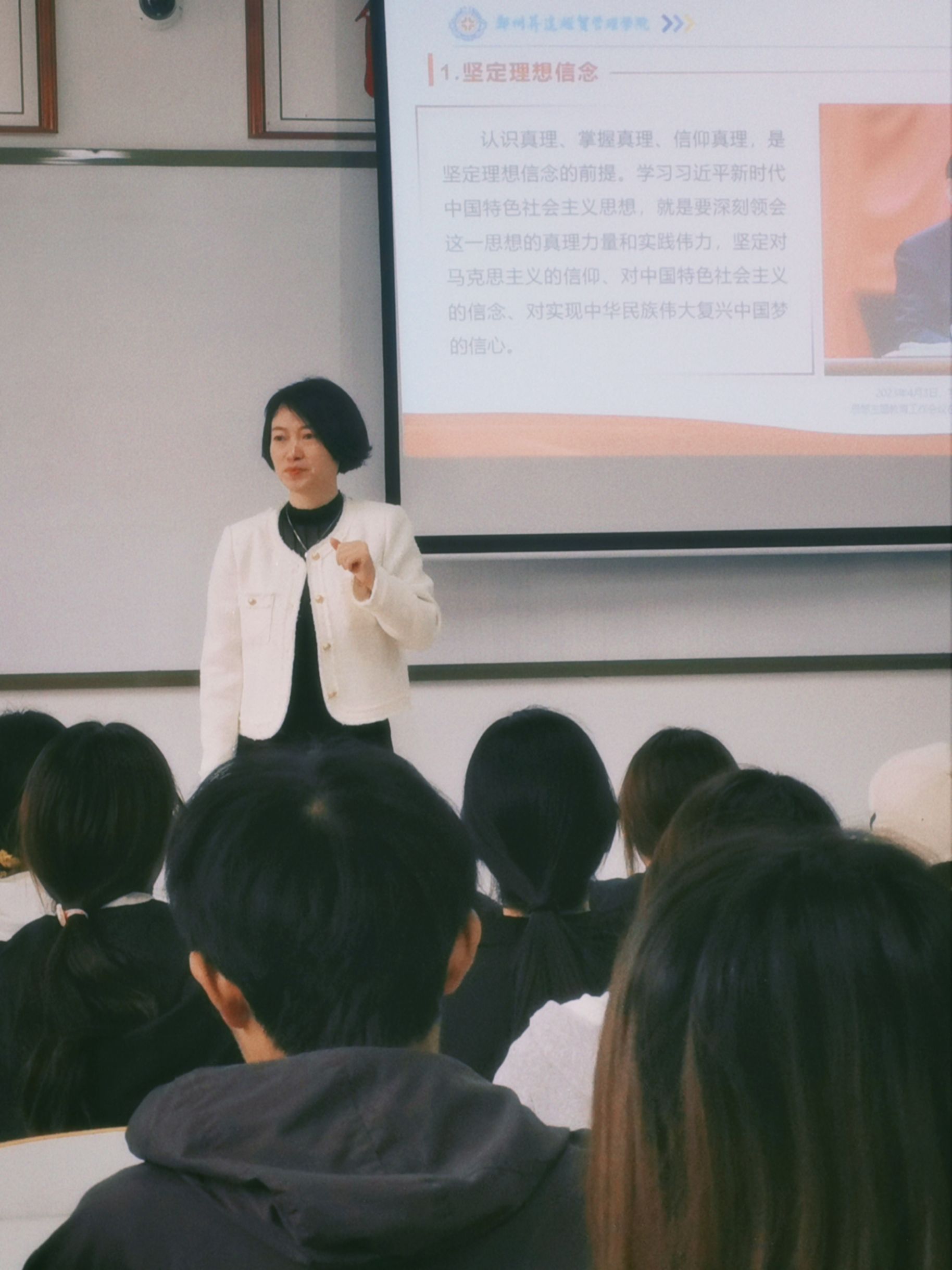课堂上,崔经理以饱满的热情和深厚的理论功底,为师生们带来了一场深刻的思想洗礼。首先她强调了理想信念对于个人成长和国家发展的重要性,指出只有坚定理想信念,才能在面对困难和挑战时保持定力,勇往直前。接着,经理结合外语教育的特点,阐述了在新时代背景下,外语人才应具备的素质和能力。外语人才不仅要具备扎实的语言基础,更要具备深厚的文化底蕴和国际视野,才能够为国家的发展和国际交流贡献力量。在授课过程中,崔经理还通过丰富的案例和生动的语言,引导同学们深入思考如何在外语学习中坚定理想信念,将个人发展与国家需要紧密结合。最后,崔经理鼓励同学们要敢于担当、勇于创新,在新时代的征程中书写升达外院发展的新篇章。课后,同学们纷纷表示,这次思政第一课让他们深受启发。