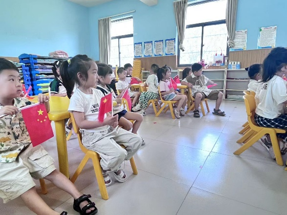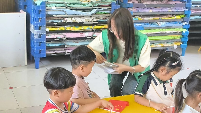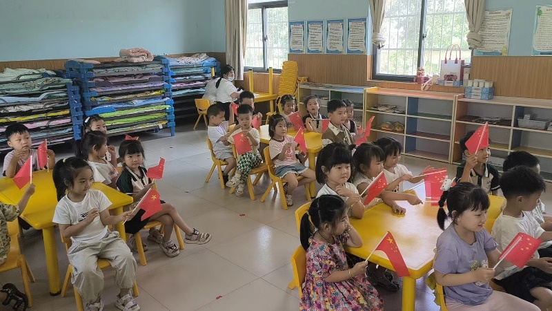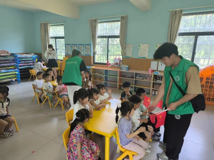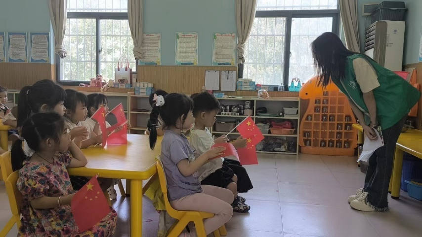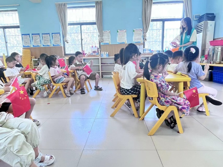 到达幼儿园后实践团的成员们化身幼儿教师,带领小朋友们通过有趣的游戏和生动的讲解认识了国旗。对于幼儿来说,小红旗的颜色、形状等特征可以帮助他们进行观察和认知,丰富他们的感官体验。同时也激发了他们的集体意识,当幼儿们一起拿着小红旗时,可以让他们感受到集体的力量和团结,培养他们的集体荣誉感。