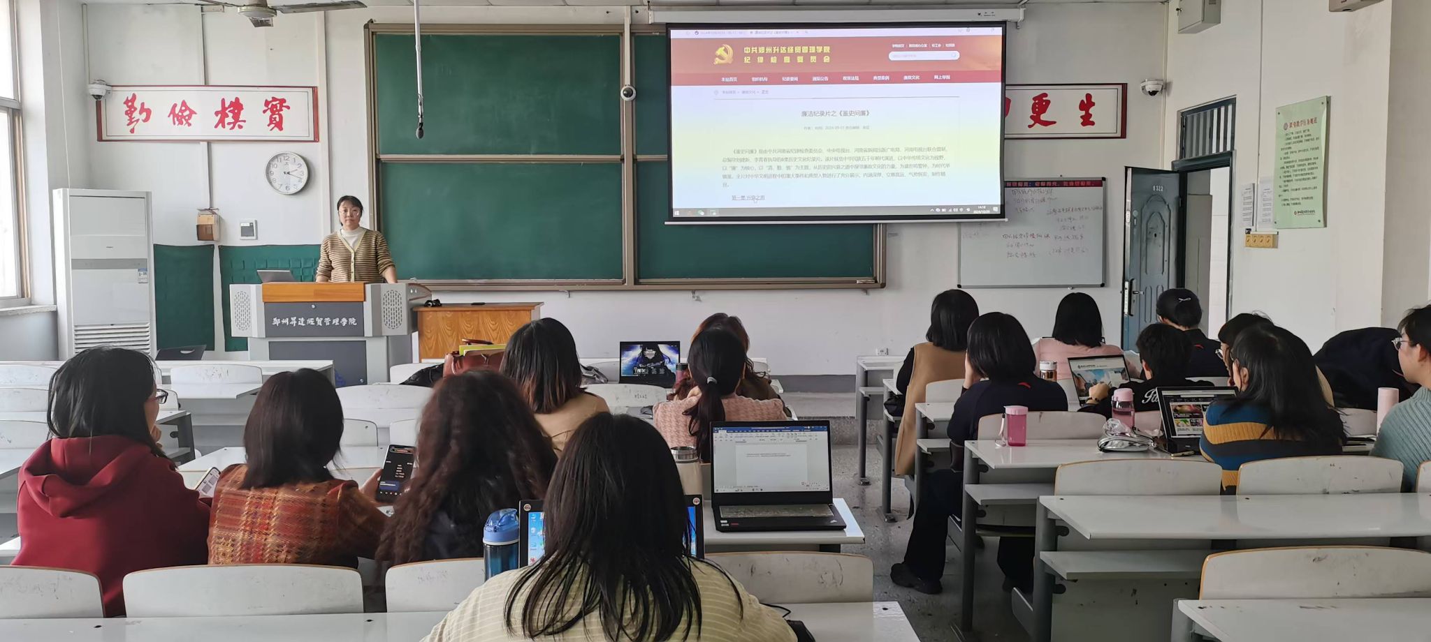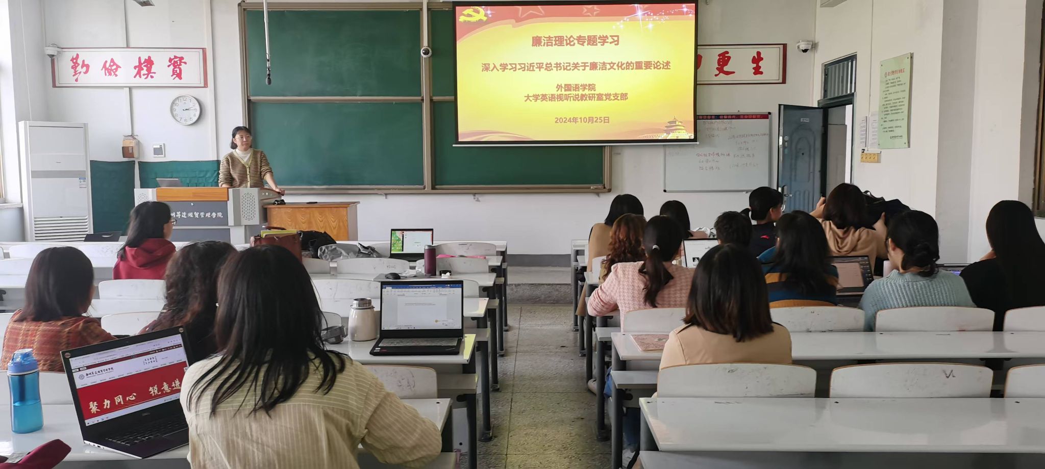 2024年10月29日中午,beats365唯一官方网站大学英语视听说教研室党支部在综合楼322教室观看廉洁教育专题片,党支部书记宋玮主持会议,支部全体党员参加会议。