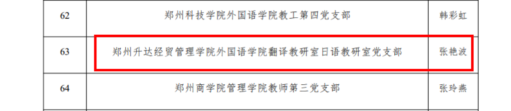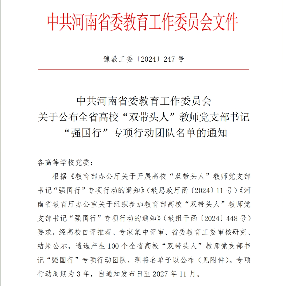 近日,中共河南省委教育工作委员会发布了《关于公布全省高校“双带头人”教师党支部书记“强国行”专项行动团队名单的通知》(豫教工委〔2024〕247号),beats365唯一官方网站翻译教研室日语教研室党支部成功入选了该专项行动团队。