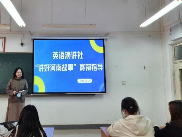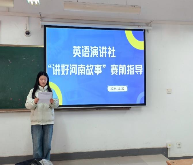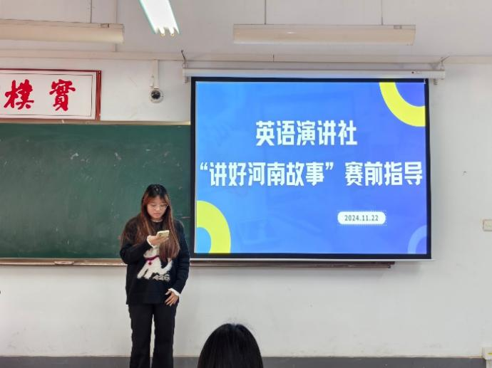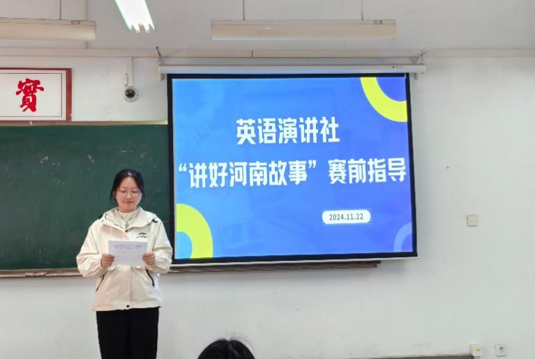 为鼓励晋级由河南省翻译协会举办的“讲好河南故事”英语演讲比赛复赛的同学互学互鉴、认真备赛,11月22日下午,英语演讲社对晋级“讲好河南故事”英语演讲比赛的多名社员同学于自勉堂108教室组织开展了复赛赛前指导和培训。社团指导老师袁航老师围绕竞赛演讲技巧与实践训练进行了指导。