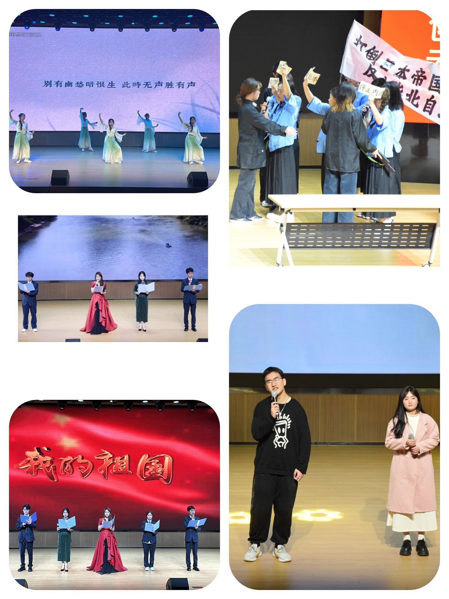 本次晚会共有10个节目,以舞蹈《琵琶行》拉开序幕,悠扬的乐音仿佛将观众带入了千年前的诗意世界,感受岁月的沧桑与情感的细腻。接着,《热血的青春》,《大写的中国》和歌曲《紫荆花盛开》展现了当代青年的朝气蓬勃与拼搏精神,传递出积极向上的青春力量。同时,也彰显了祖国领土完整的坚定信念和对祖国深深的敬仰与热爱。随后,《我的祖国》,《破晓》和《月光下的中国》唤起了人们对祖国母亲的无限眷恋,让我们沉浸在了对祖国大好河山的赞美中,和对美好未来的不懈追求。随着热烈的掌声,《明天会更好》和《永远的一二九》汇聚了全体参演人员的美好期许,表达对和平、繁荣的向往。同时,也带着我们重温了青年员工的爱国壮举,再次告诫同学们铭记历史的厚重与使命的担当。最后,晚会在《我和我的祖国》的深情歌声中圆满落幕,同学们的歌声唱出了青年的爱国情怀,激发着强烈的民族自豪感。