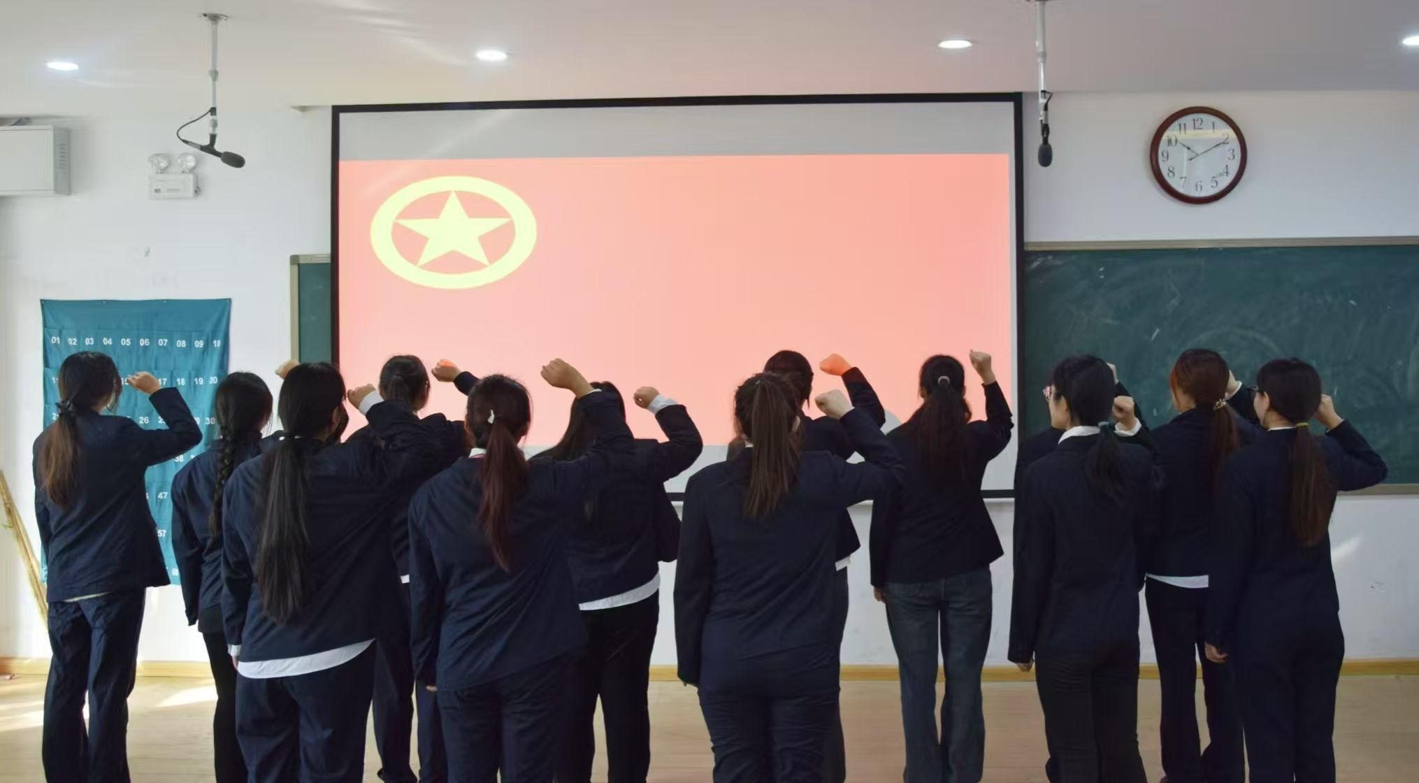 伴随着庄严的国歌声,入团仪式正式开始,院团委组织部部长宣读了2024年下半年新发展团员名单,团委书记丁玥老师和团委副书记武珍毅老师共同为新发展团员佩戴团徽。随后,在庄严的团旗下,全体新团员举起了右手,面向团旗庄严宣誓。