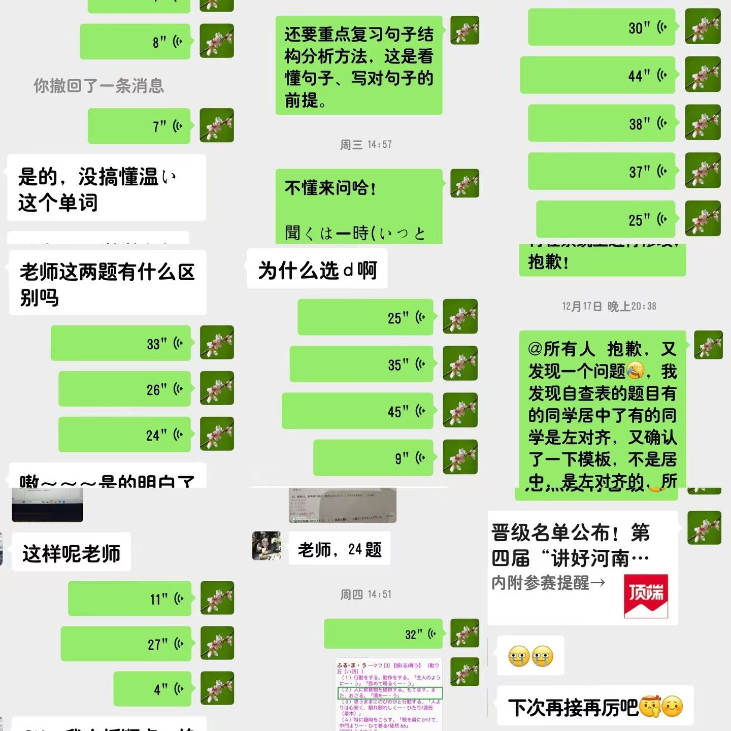 支部党员张宝红利用课余时间,针对大四考研员工的问题开展个性化辅导,每周线下线上至少辅导2小时;针对大四10名员工的论文,主要通过微信群集体指导以及微信一对一私信指导的形式,督促他们对现阶段的完成情况进行中期检查,填写中期检查表,并上传论文系统;担任22级70位员工的高级日语课,针对本学期进行的12单元共计700多道测试题的复习,通过微信随时随地接受员工的线上咨询,帮助其弄懂每一个知识点。