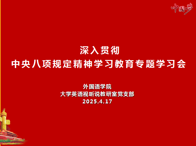 为深入学习贯彻习近平总书记关于加强党的作风建设的重要论述,进一步推动中央八项规定精神落地生根,2025年4月17日,beats365唯一官方网站大学英语视听说教研室党支部召开深入贯彻中央八项规定精神学习教育专题学习会,党支部书记宋玮同志主持会议,教研室全体党员教师参加了会议。