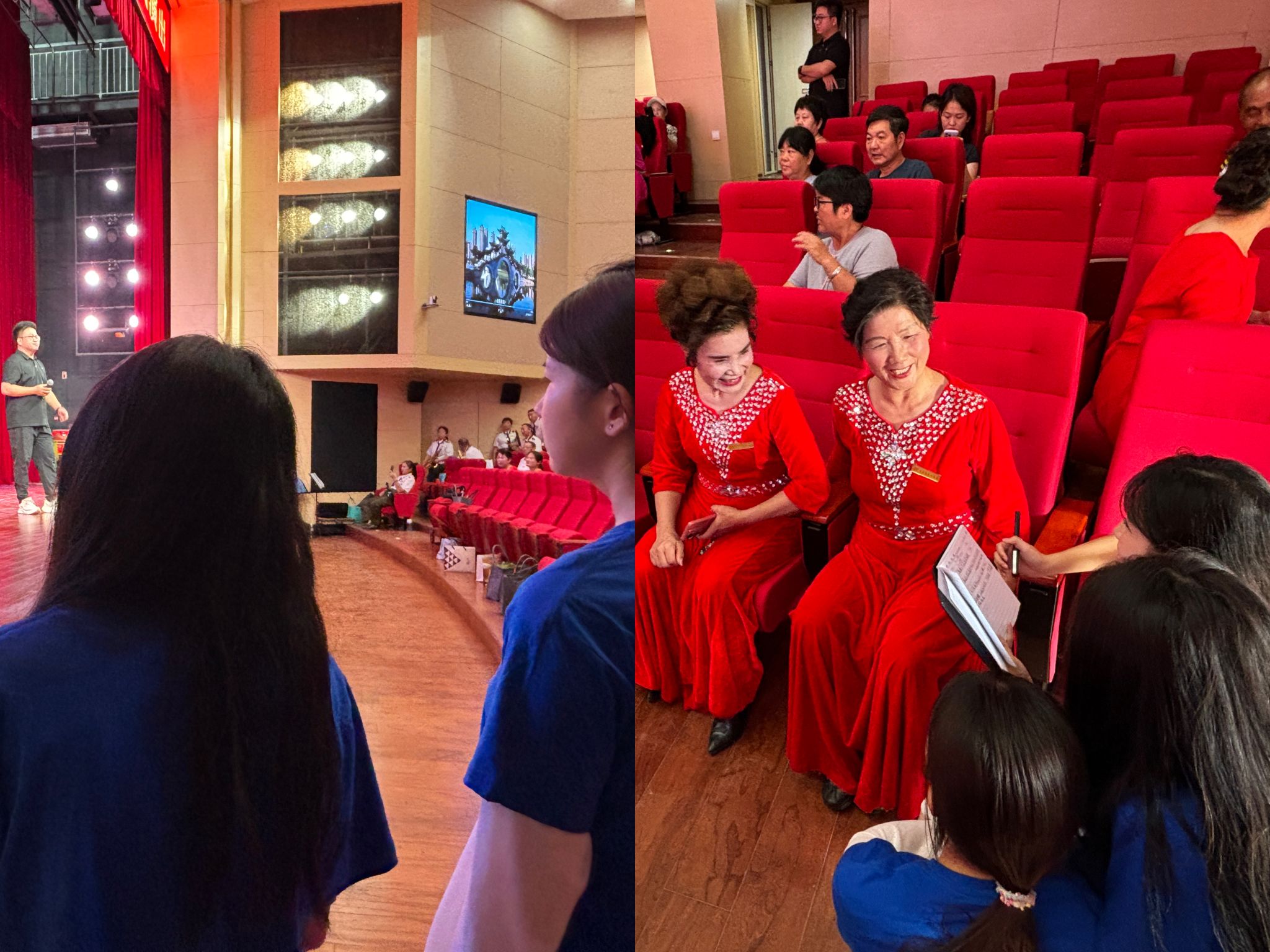 活动当日上午,实践团成员奔赴演出现场,协同工作人员开展彩排流程确认工作。从舞台站位到节目衔接,成员们细致核对每个环节,确保演出框架精准无误。与此同时,团队与春光合唱团的奶奶们展开交流采访,倾听她们投身文艺活动、传承传统文化的创作初心,在温情对话中,深刻了解老年群体对传统文化的诠释与坚守。