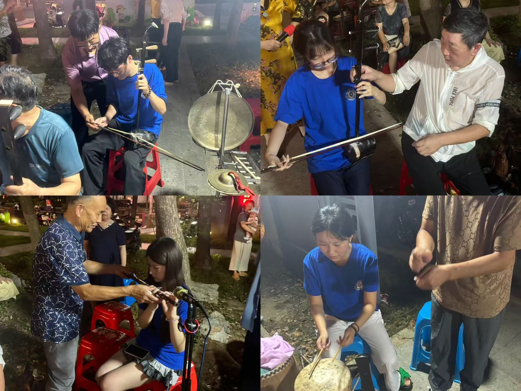 演出间隙,实践团成员们围在艺术家身边,开启了戏曲学习环节。二胡的悠扬、笛子的清亮,艺术家们耐心讲解乐器的使用技巧,手把手教导成员们握弓、按弦、运气,从基础的指法到简单的曲调,成员们在一遍遍练习中体会着戏曲器乐的精妙。