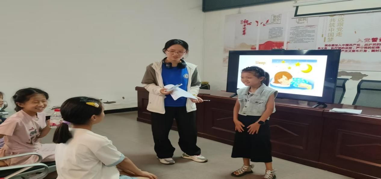 双语教育启蒙,借助双语绘本,用简单英语讲述乡村故事,如介绍农产品、非遗文化等,通过情景模拟、角色扮演,实践团成员组织趣味游戏互动,鼓励小朋友上台分享对英语的认知,让英语学习变得轻松有趣,激发小朋友对英语教育的接受度与积极性。