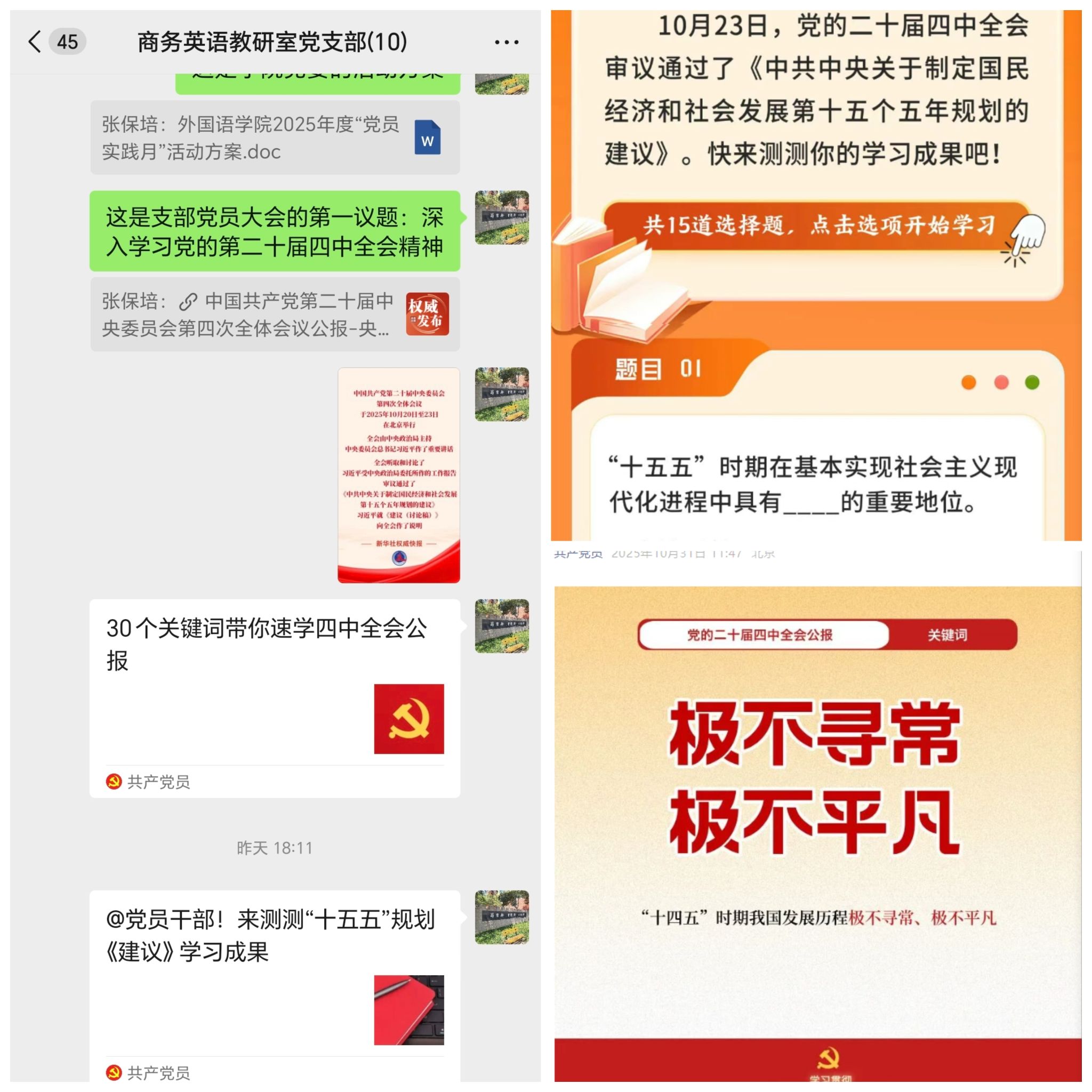 会议首项议程聚焦理论学习,通过“线上+线下”双轨模式深入开展党的二十届四中全会精神专题学习。支部微信群同步推送《30个关键词速学四中全会公报》,并组织参与共产党员公众号发起的“十五五”规划建议学习成果测试”,重点研读《中共中央关于制定国民经济和社会发展第十五个五年规划的建议》核心内容。