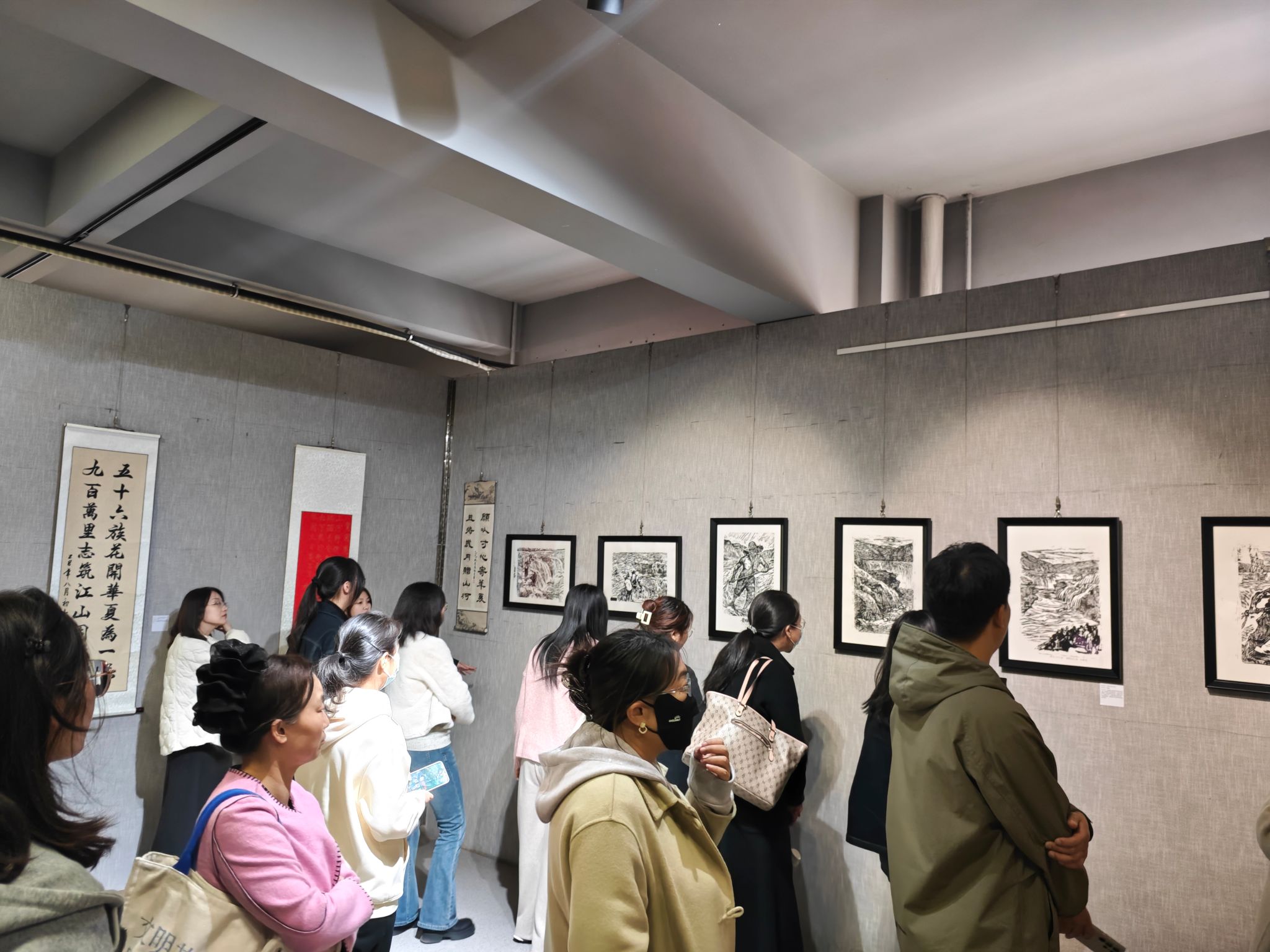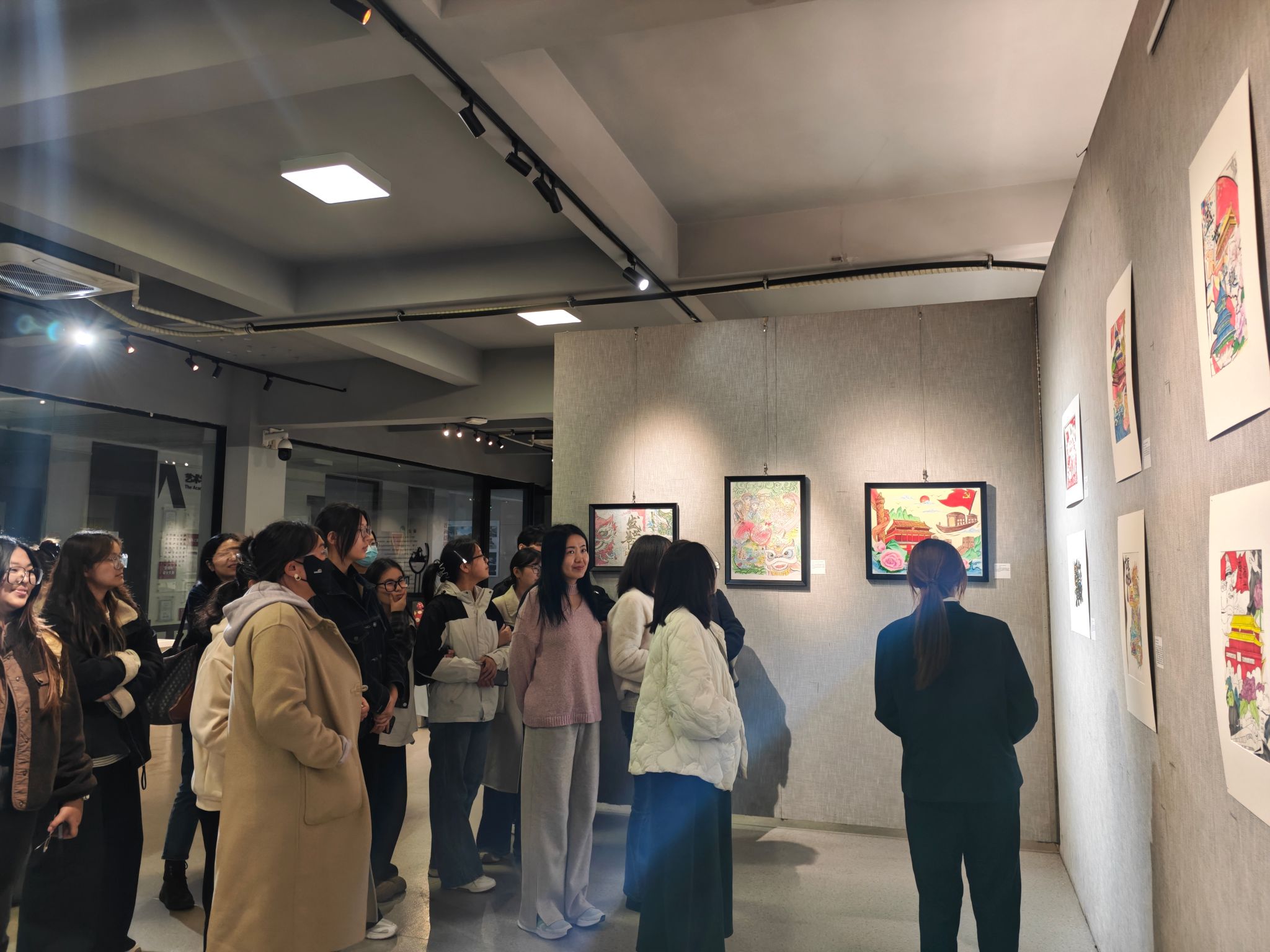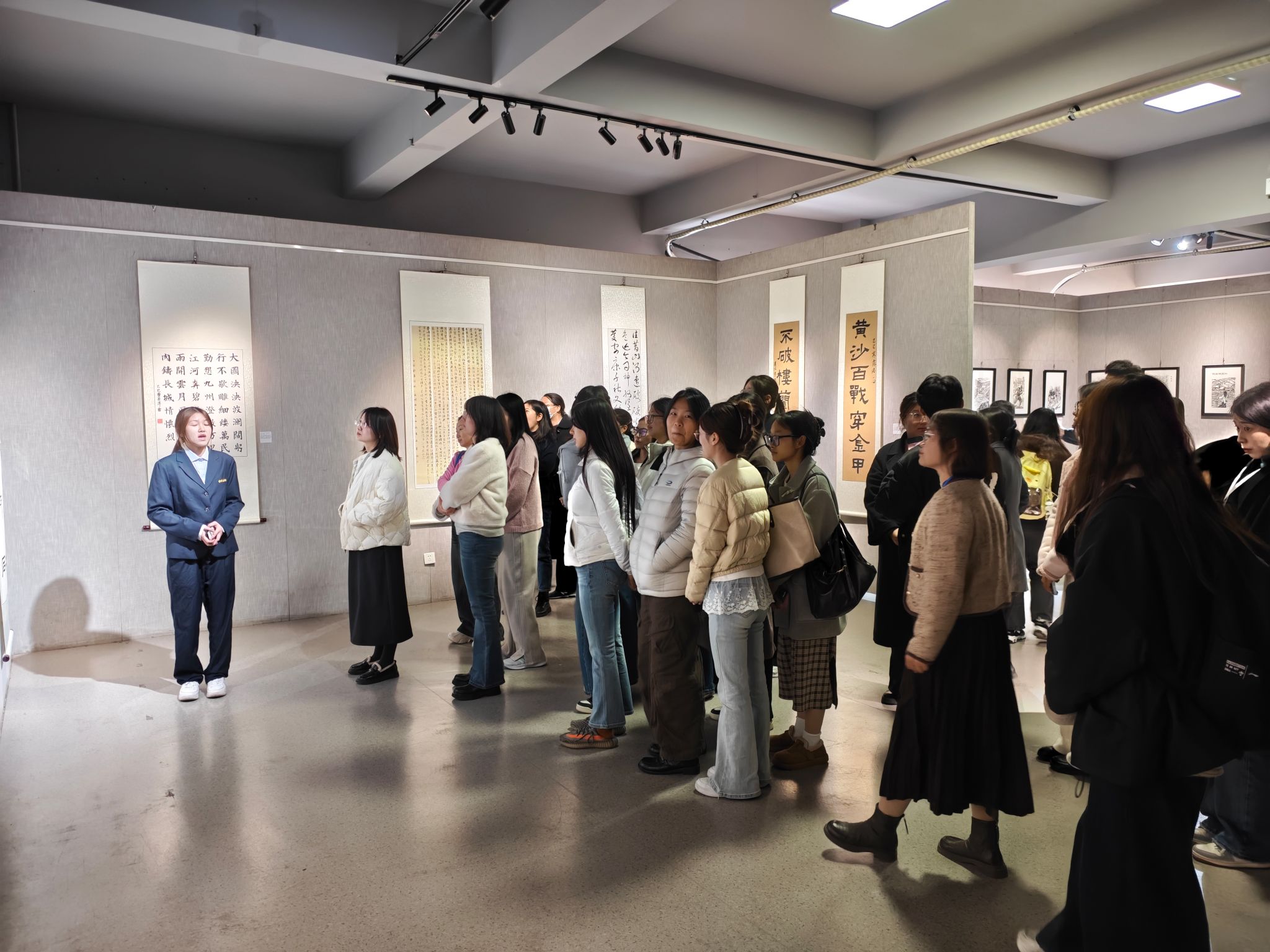 在参观过程中,本院师生代表于艺术楼前集合后有序进入展厅,由党委统战部培训的员工讲解员进行全程导览。讲解员结合创作背景与思想内涵,深入解读作品背后的民族情感与时代价值,引导师生深刻理解“中华民族共同体”的核心要义。现场氛围庄重而热烈,师生认真聆听、驻足交流,接受了一次直观而深刻的爱国主义和民族团结教育。