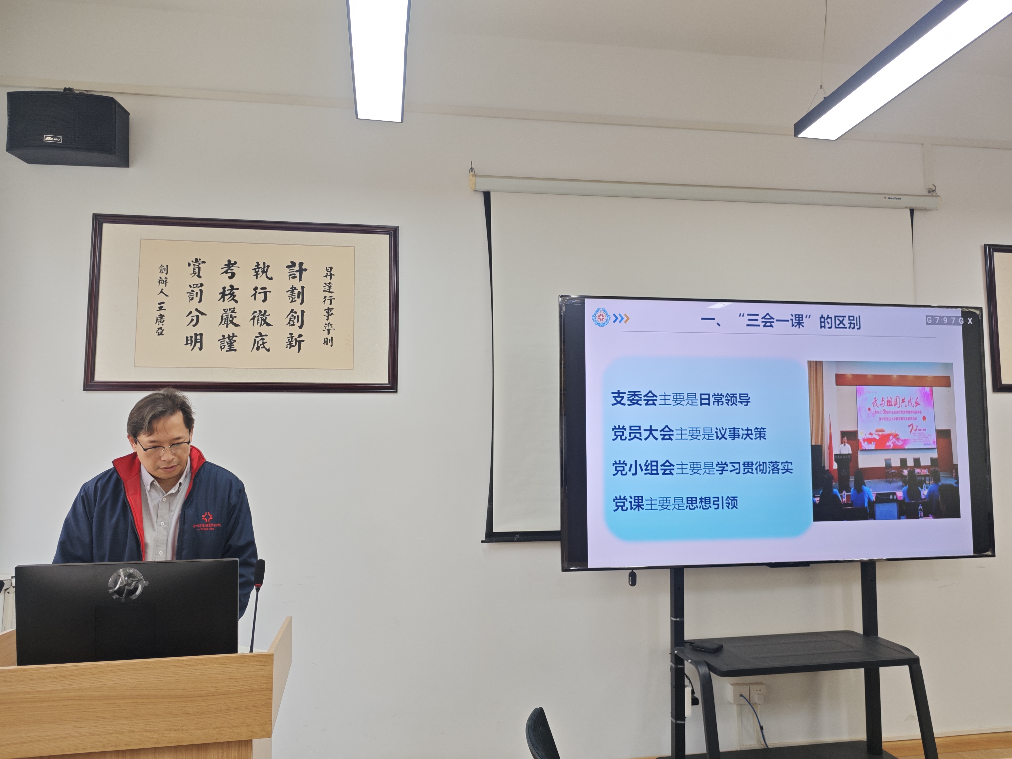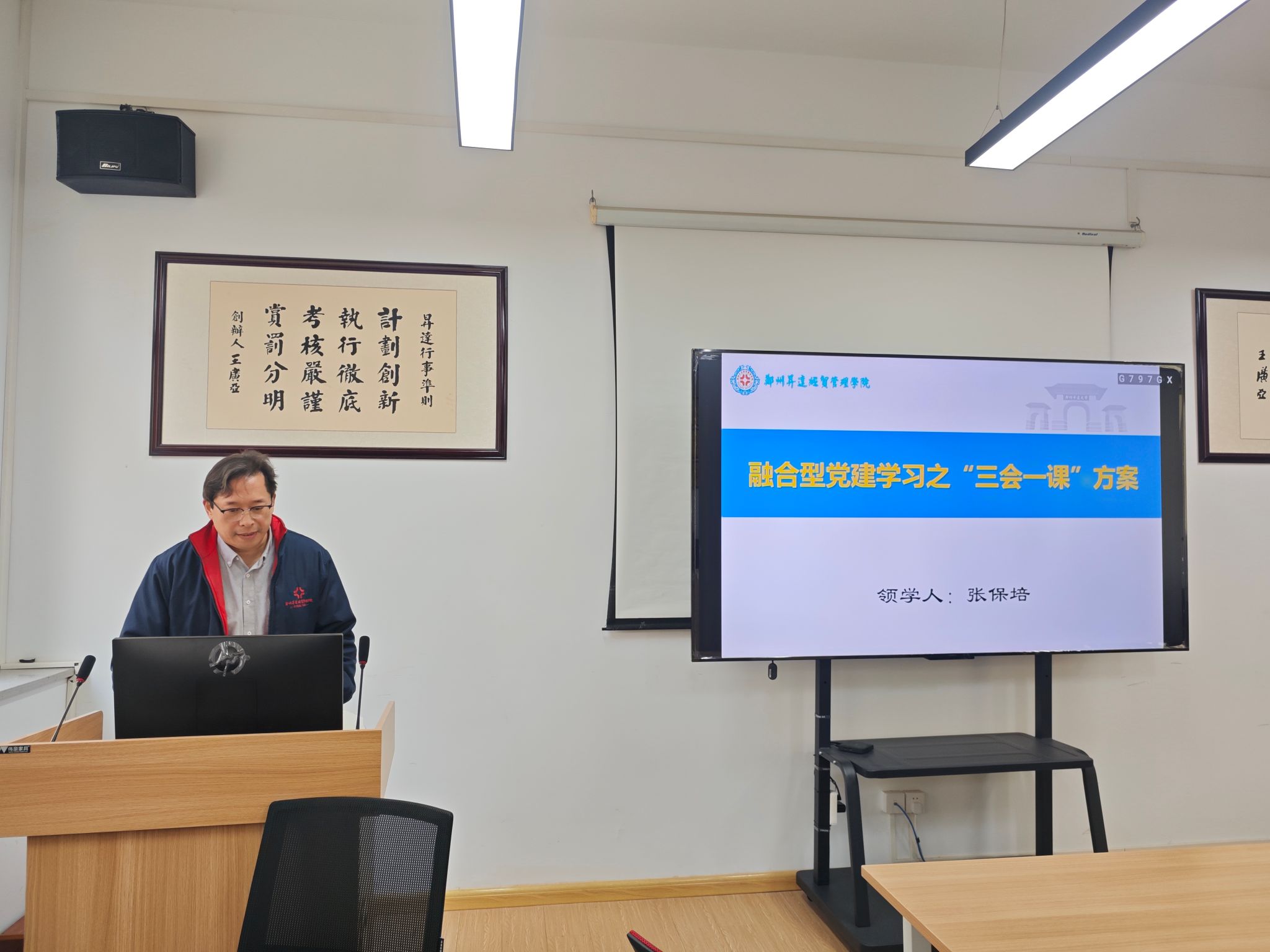 首先,商务英语教研室党支部书记张保培同志围绕《融合型党建》第八篇“融合型‘三会一课’方案”开展专题领学。其主讲PPT标题为《融合型党建学习之“三会一课”方案》。他结合支部实际,系统解读了如何将专业特色融入“三会一课”制度运行,提出通过项目化设计、主题化推进、成果化呈现等方式增强组织生活的吸引力与实效性,实现政治功能与育人功能的有机统一。