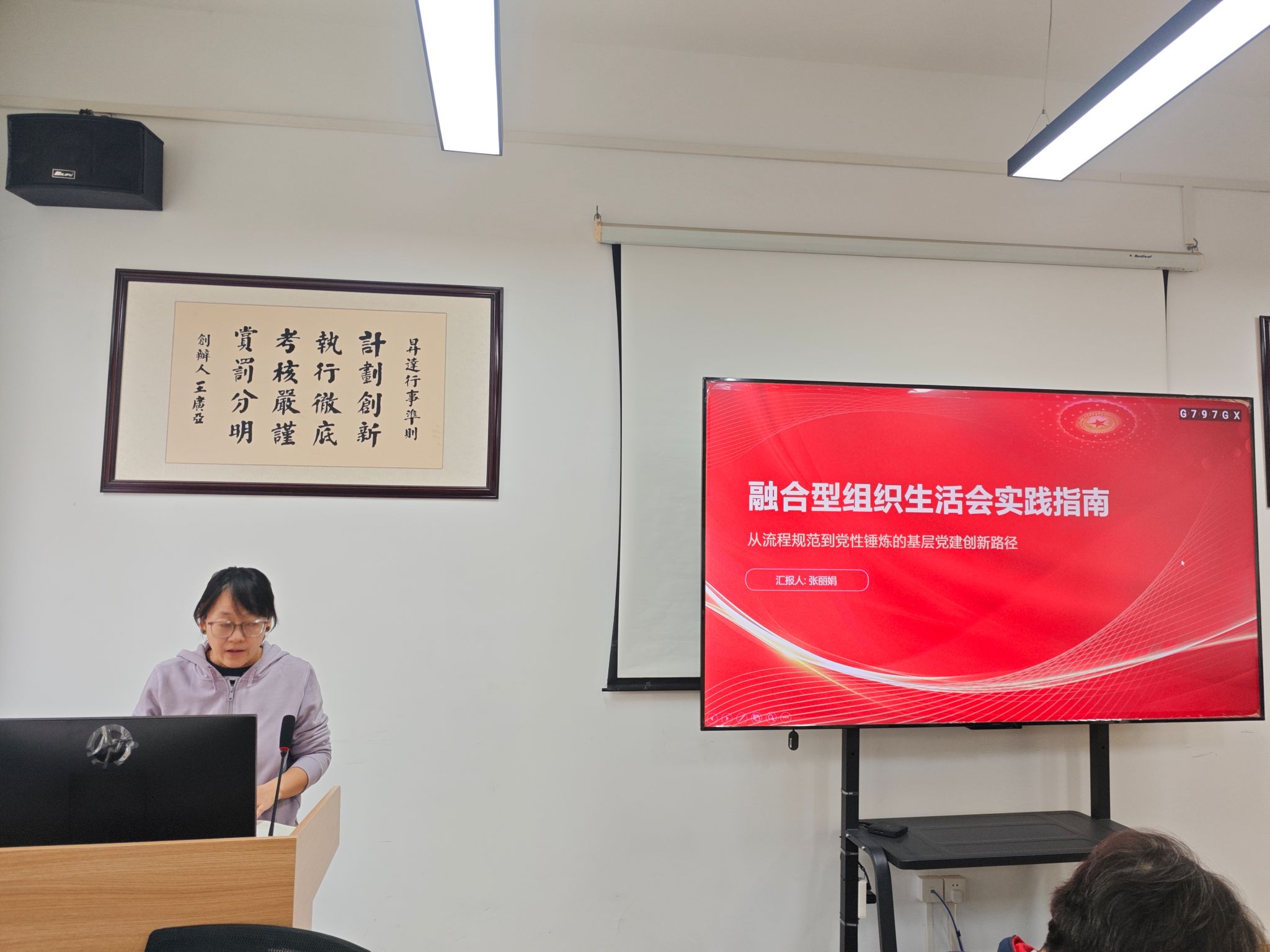 其次,英语教研室党支部书记张丽娟同志领学《融合型党建》第九篇“融合型组织生活会”,其授课PPT标题为《融合型组织生活会实践指南》。她重点讲解了如何构建目标导向明确、流程规范严谨、问题整改到位的融合型组织生活会机制,分享了本支部在会前调研、批评和自我批评环节创新、会后跟踪落实等方面的实践经验,为其他支部提供了可借鉴的操作路径。