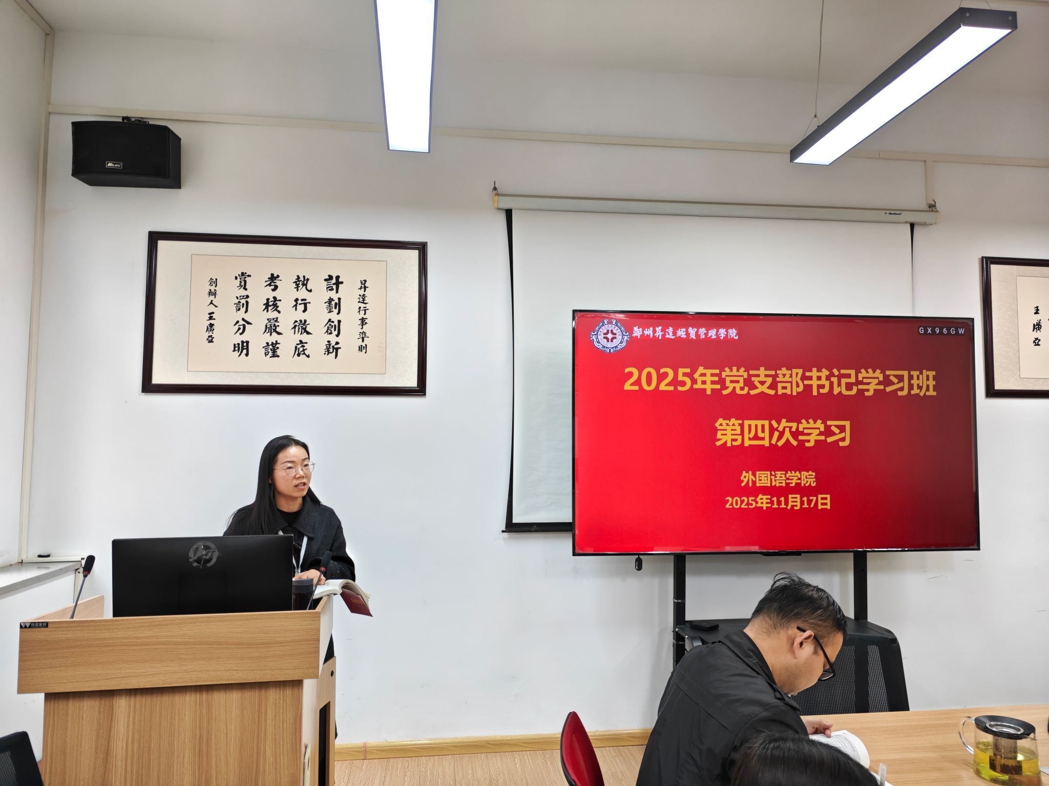 随后,翻译、日语教研室党支部书记孙燕冉同志领学《融合型党建》第七篇“融合型党课”。她重点讲解了如何打破传统党课“单向灌输”的模式,探索“专业+思政”双融双促的授课路径。通过引入课程思政元素、结合翻译实践中的文化使命、讲好中国故事等主题,使党课内容更具时代性与亲和力。她还介绍了本支部开展“情景式党课”等创新形式的经验做法,有效提升了党课的吸引力和实效性。