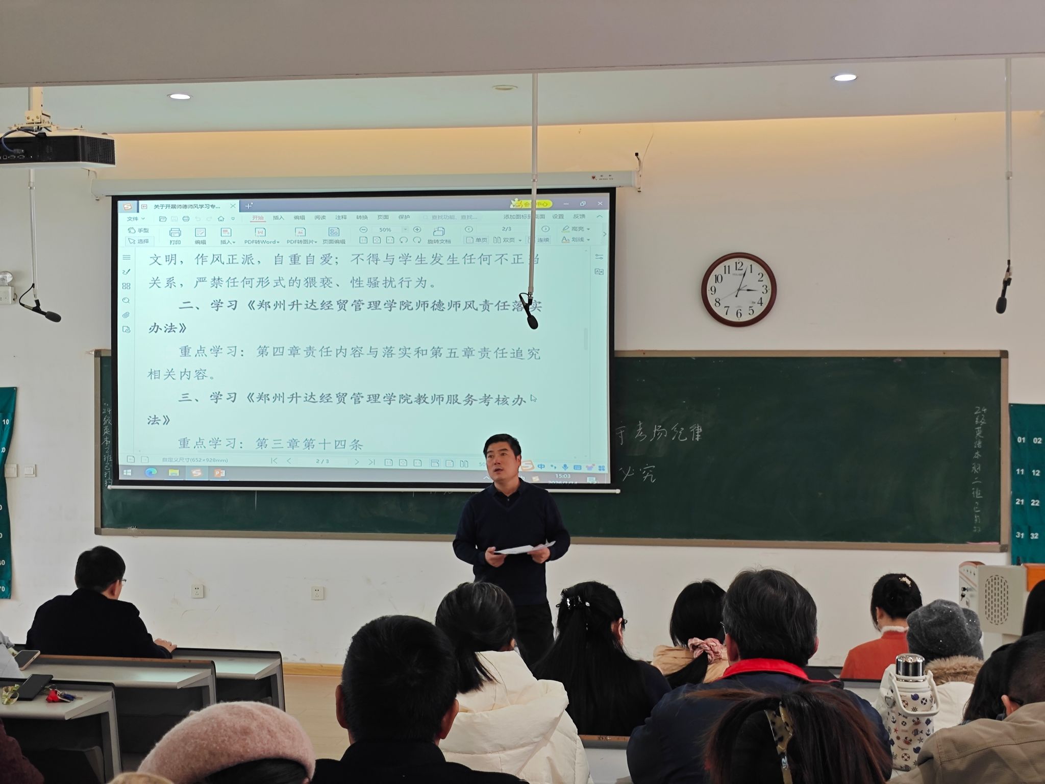 会议首先通报了河南省教育厅披露的的依法撤销五名高校教团队格的典型案例,强调师德失守的严重后果,并结合近期发生各种案例,指出加强师德师风建设的紧迫性与必要性。
