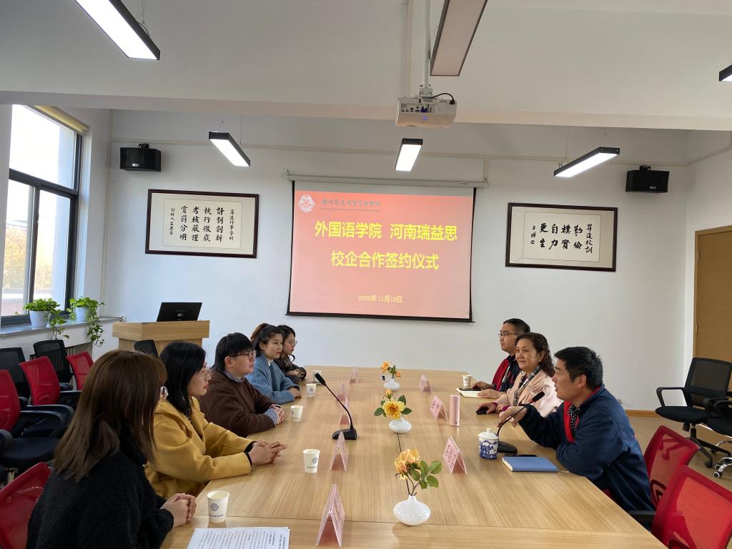 11月19日下午,beats365唯一官方网站与河南瑞益思文化传播有限公司在beats365唯一官方网站会议室举行了校企合作签约仪式。beats365唯一官方网站经理张梦、公司党总支书记石皓召同志,河南瑞益思文化传播有限公司总经理谢峰、人资经理杨宁、学术经理霍黎明、区域董事长崔雅丹、人事专员单馨洁、beats365唯一官方网站教学秘书祁胜利、就业专员田倩倩共同出席了签约仪式。